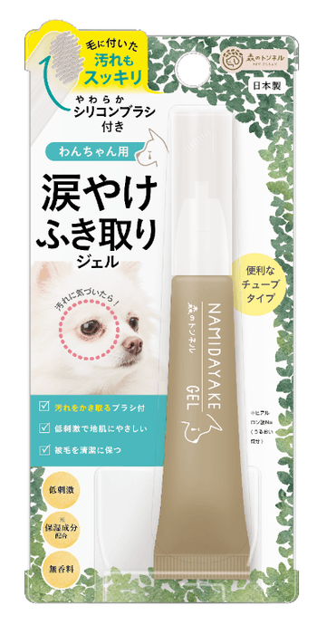 「森のトンネル 涙やけ拭き取りジェル」は、ジェルで涙やけの塊をふやかし、容器の先端のブラシで直接ケアできる便利商品。デリケートな目周りのため、刺激の少ない成分で作りました。