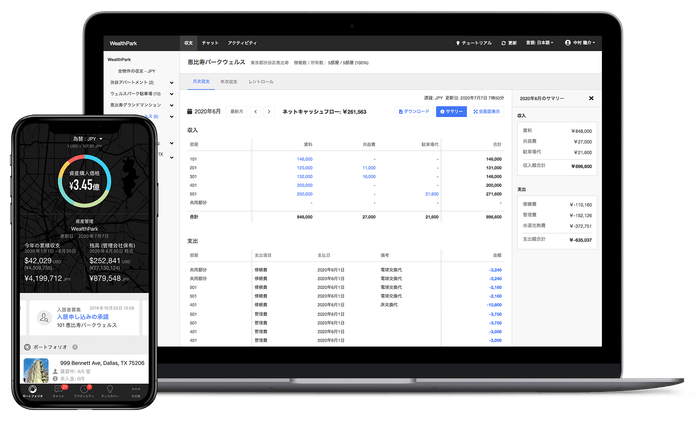「WealthPark」は、不動産賃貸管理の収支などがスマホアプリやWebサイトで確認できる不動産オーナー向けの資産管理ツールです。