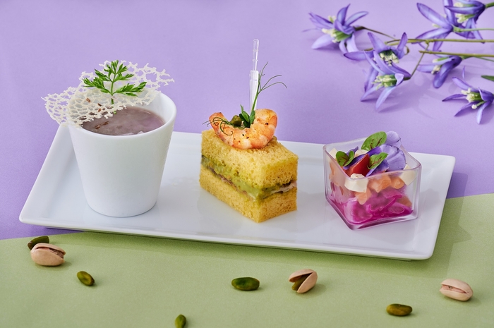 セイボリーには、ピスタチオのベシャメルを使用した「小海老と生ハムのホットサンド ピスタチオソース」や、「ヴァイオレットベジタブルとサーモンのセビーチェ ガーデン風」、「紫人参のクレシーポタージュ」など秋しか味わえない味覚をお愉しみいただける内容に仕上げました。