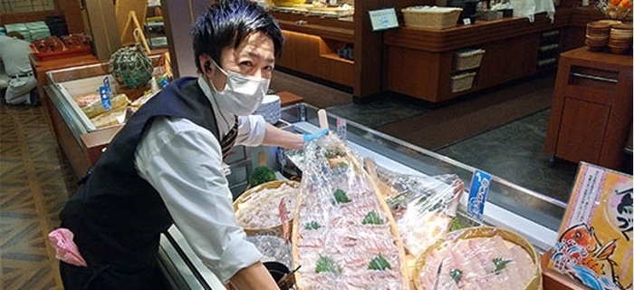 上:天草ホテル亀屋の自慢「朝どれ地魚のお造り盛り合わせ」を冷蔵ケースに。地元水揚げの魚を中心に8種類前後のお造りを楽しめる一番人気メニューは、その分無くなるのも早いので適切なタイミングの提供に常に目を光らせます。