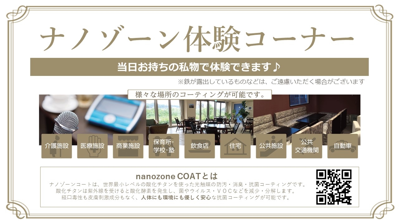 新型コロナの不活性化に成功したナノゾーンの施工をお持ち込みの私物で体験できます。