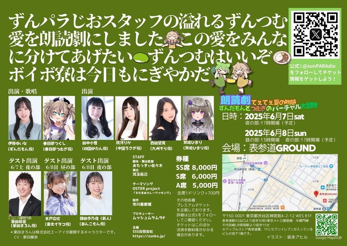 『朗読劇てぇてぇ夏の物語:ずんだもんとつむぎのバーチャル大冒険』が2025年6月7日 (土) 〜 2025年6月8日 (日)に表参道GROUND(東京都渋谷区神宮前4丁目2-12 WES B1F)にて開催されます。