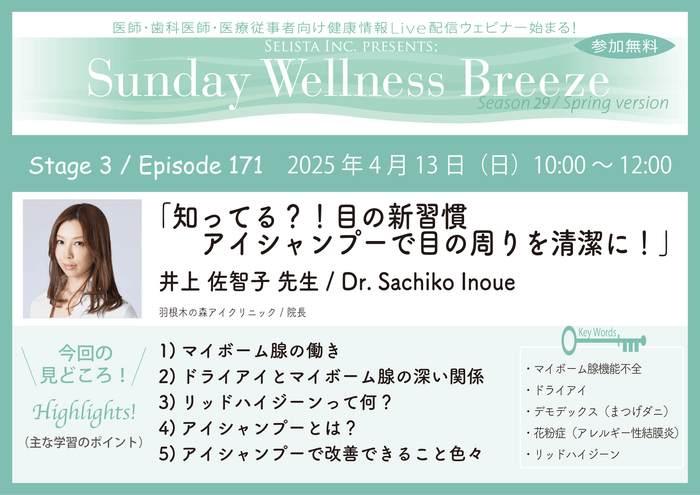 セリスタ株式会社(東京都千代田区 代表取締役:伊藤 承正)は、2025年4月13日(日)に、井上 佐智子先生(羽根木の森アイクリニック/院長)を講師にお迎えし、医師・歯科医師などの医療従事者向け無料Zoomオンラインセミナー『知ってる?!目の新習慣 アイシャンプーで目の周りを清潔に!』を開催します。