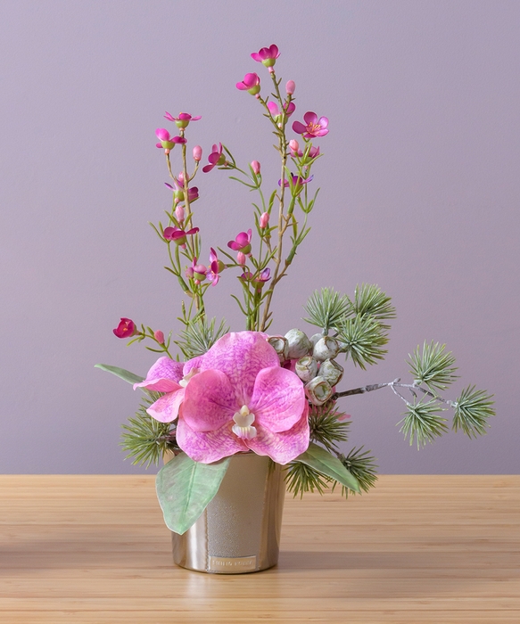 ラベンダーピンクが新鮮でバンダが舞い踊るような優美な迎春コレクション。高級感のある花器と色鮮やかなバンダの色彩が相まってより雅やかなお正月飾りに。