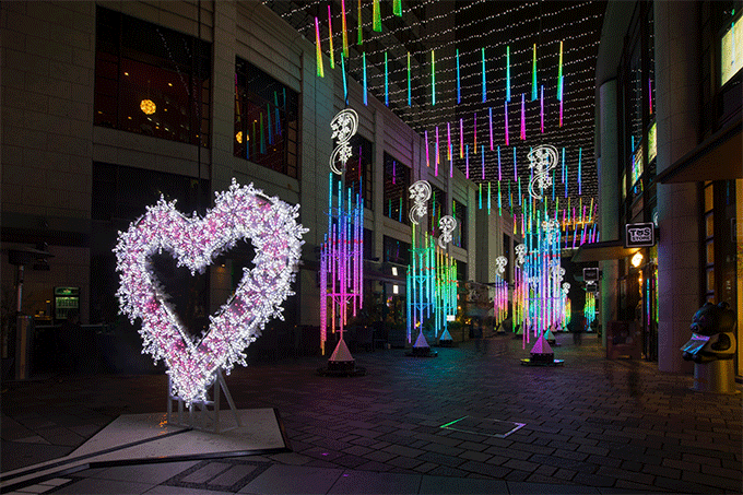 「音×サカス」の名にふさわしく、今年も光と音楽の演出は健在。クリスマスやバレンタインの季節に合わせた馴染みのある音楽に合わせて、イルミネーションの輝く光が踊りだします(※音と光の演出あり)。