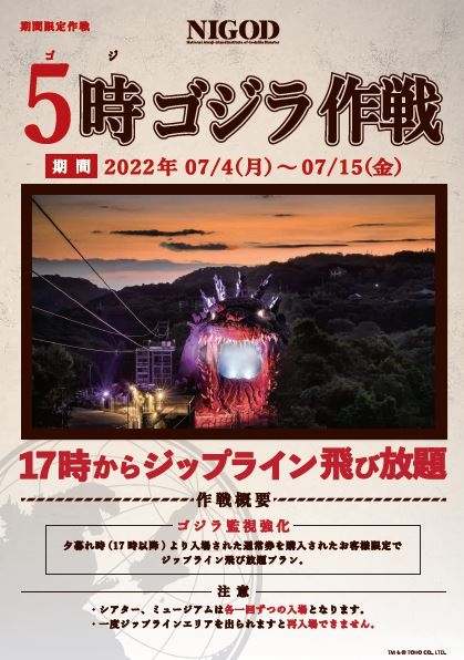 淡路島で活動を停止していたゴジラに、微量のバイタルサインの変化が確認されています。NIGOD では、今回のゴジラの変化について研究を進めるため、「5 時ゴジラ作戦」を再開することを決定しました!参加者は、7月4日(月)~7月15日(金)までの期間限定で、毎日17:00 以降、2 つのジップラインコース「体内監視コース」「体表監視コース」を、何度でもご利用いただけます。友達や家族を連れて「5 時ゴジラ作戦」に参加し、ゴジラの変化を解明するためにジップラインで調査にでよう!