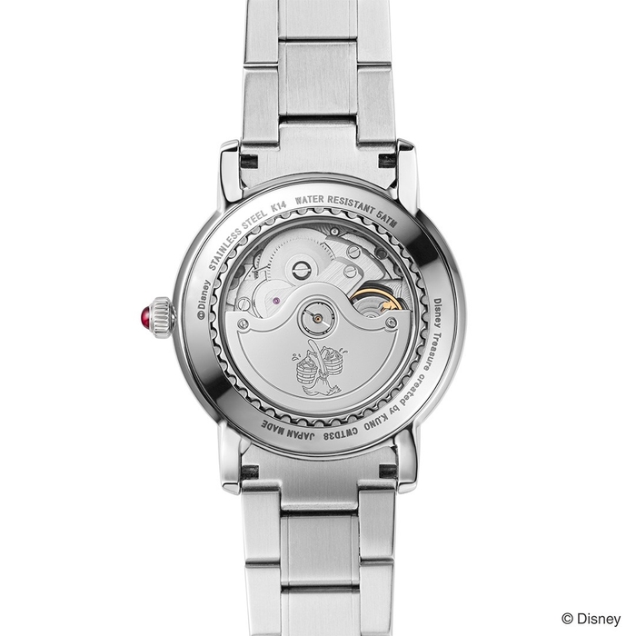 シースルーの裏面の中でゆらゆら揺れ動いて自動でゼンマイを巻きあげるローターパーツには、水を運ぶ“ほうき”の姿を刻印。ファンにはおなじみの、物語の象徴的なシーンをこっそりと忍ばせました。