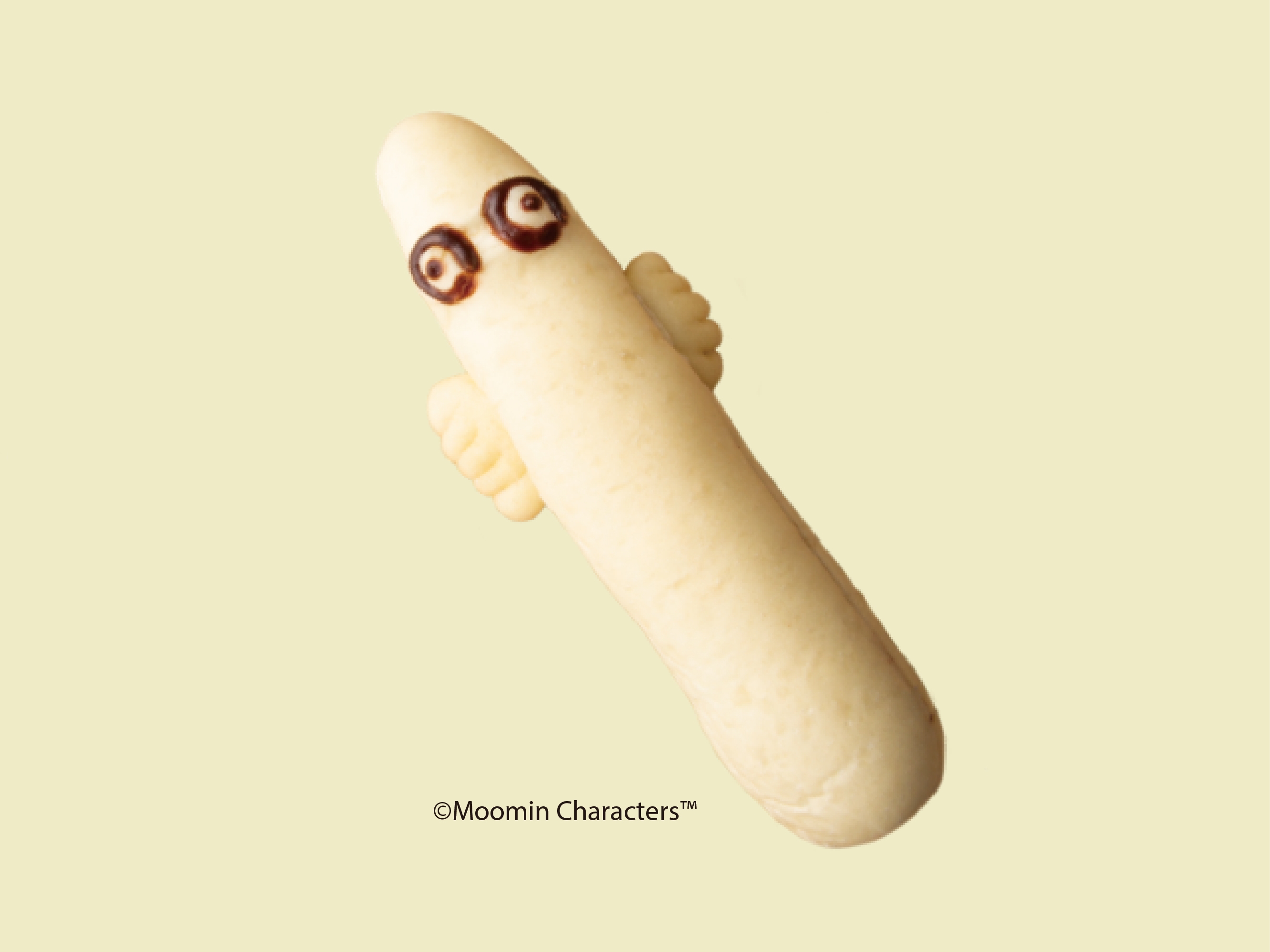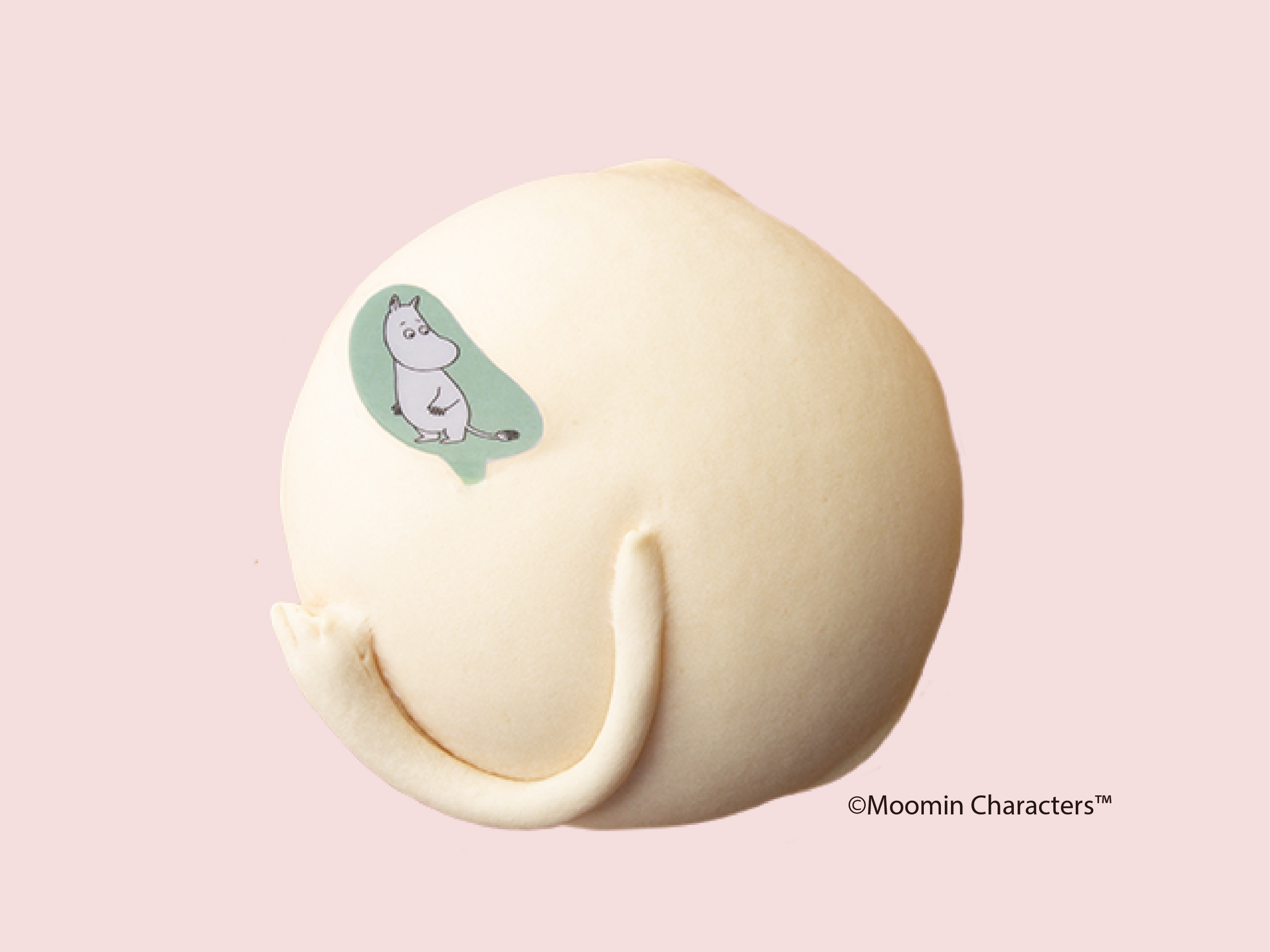 ムーミンの漫画の1コマ目はいつもムーミンのおしりから。そんなファンの心をくすぐるムーミンのおしりをパンで表現しました。やわらかいソフトで白いメロンパンに練乳カスタードクリームを絞り、ムーミンのカラーを表現しました。
