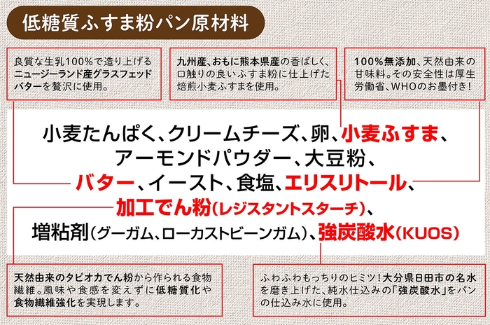 「低糖質ふすま粉パン」は独自の製造技術により、パンのおいしさを保ちながら糖質88%オフと糖類ゼロを実現。その糖質量はたったの2.7g。絹ごし豆腐1/2丁と同等の糖質量まで抑えました。普段食べているパンをこの「低糖質ふすま粉パン」に置きかえるだけで、簡単に糖質を抑えることができ、肥満ホルモンを正常化させてダイエットをサポートします。また、熊本県産小麦ふすま粉をつかい、大分県日田市の強炭酸水で“もっちりふんわり食感”に焼き上げました。食物繊維もたっぷりで栄養バランスも抜群。原料は香料や着色料、保存料など合成添加物は一切つかわず天然素材を贅沢に使用。安心しておいしく召し上がっていただける低糖質パンをお届けします。