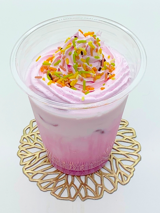 ピンク色のホイップクリームとカラフルチョコスプレーがキュートな冷たいチョコレートドリンク。