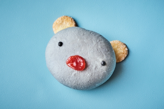ペネロペの特徴である耳はクッキー生地で、大きな赤いお鼻をドライストロベリーで表現。パンの中のクリームはミルクチョコレートにオレンジピールとナッツ、クリームチーズをあわせ、食感も楽しい一品。