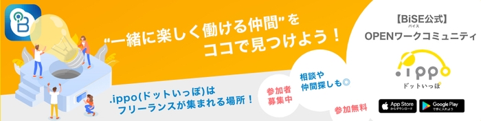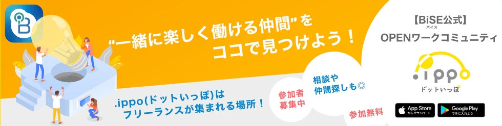 スマホアプリ「BiSE」は、信頼する仲間とクローズドな(メンバーが限定された)環境で質問や相談など、仕事上のコミュニケーションをとることに特化したアプリです。既存の仲間や、無料オープンコミュニティ「.ippo(ドットいっぽ)」で出会った仲間とBiSEで個別にワークコミュニティを作って、一人一人が互いの強みを生かしながら、"好きな人と好きな仕事をする"ためのサービスを提供しています。