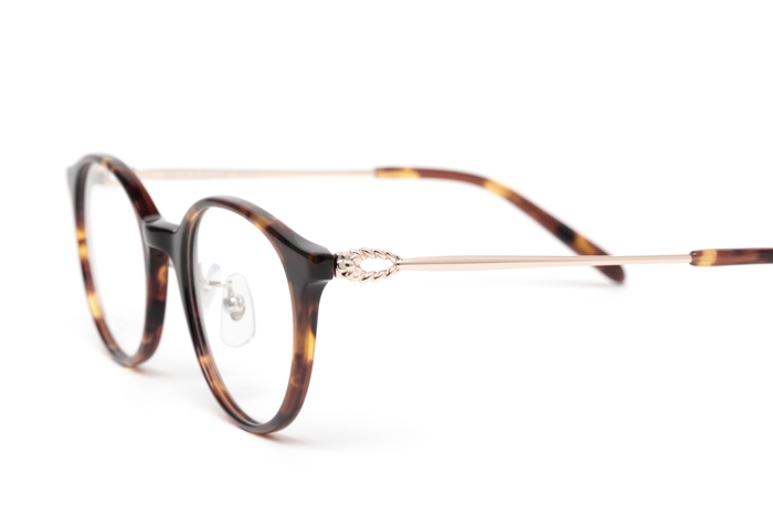 レンズ枠がプラスチック、テンプルがメタルのコンビネーションフレーム。ボストン型のレンズシェイプで、テンプルの丁番部分には花かんむりをイメージした飾りを施しました。