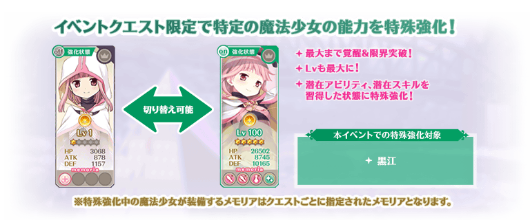 対象の魔法少女を編成して本イベントクエストをプレイする際に、ステータスを特殊な状態に強化することができます。