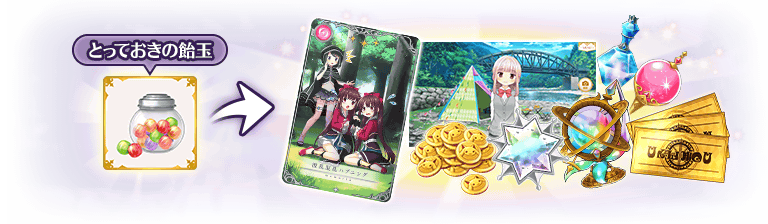 本イベントで獲得した「とっておきの飴玉」は限定メモリア「波乱混乱ハプニング」や限定ホーム背景「Little Bird's Star」等の貴重なアイテムと交換できます。