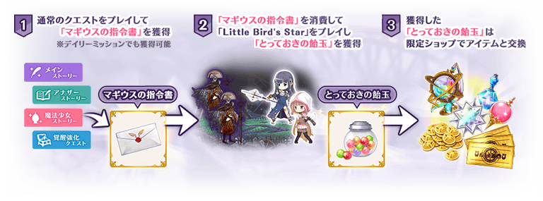 「マギウスの指令書」を消費すると本イベントのクエストをプレイでき、限定アイテムや覚醒素材と交換できる「とっておきの飴玉」を獲得できます。