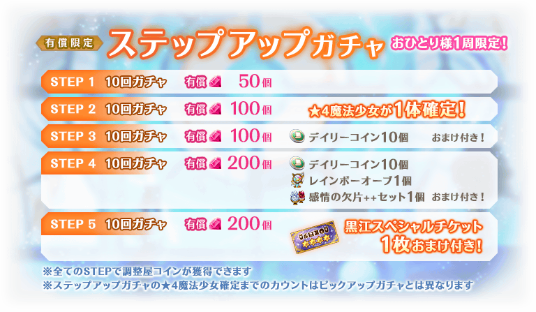 ※『有償限定 ステップアップガチャ 黒江編』の★4魔法少女確定までのカウントは『期間限定 黒江 ピックアップガチャ』とは異なります。