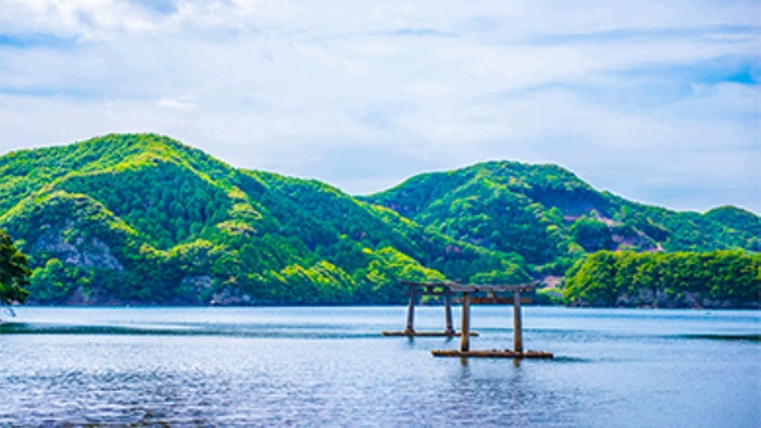 彦火火出見尊(ひこほほでみのみこと)と豊玉姫命(とよたまひめのみこと)を祭る海宮で、古くから竜宮伝説が残されています。本殿正面の5つの鳥居のうち2つは、海中にそびえ、潮の干満により、その様相を変え、遠く神話の時代を偲ばせる神秘的な雰囲気を漂わせています。また社殿の裏には、巨樹・巨木が林立し、遊歩道も完備されており、森林浴が存分に楽しめます。
