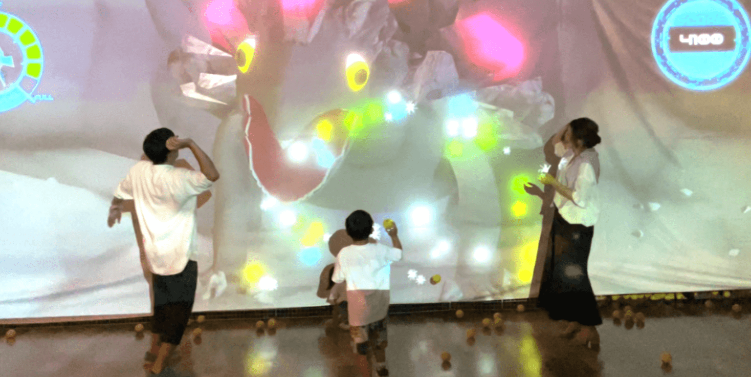 9種類のデジタルアトラクションはすべて、映像と音楽やセンサーの技術を組み合わせた、自社オリジナルです。一例として、巨大なスクリーンにプロジェクター投影されたキャラクターにタッチしたりボールを当てたりするとセンサーが感知し、キャラクターが動いたり音が鳴ったりなど、リアルとバーチャルが融合した空間で、まるでゲームに入り込んだかのような不思議な体験ができます。