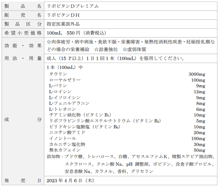 大正製薬株式会社[本社:東京都豊島区 社長:上原 茂](以下、当社)は、リポビタンシリーズ最大量となるタウリン3000mg配合に加え、同シリーズ最多となる計14種の有効成分を配合した100mLドリンク剤「リポビタンDプレミアム」(指定医薬部外品)を4月6日(木)より新発売いたします。