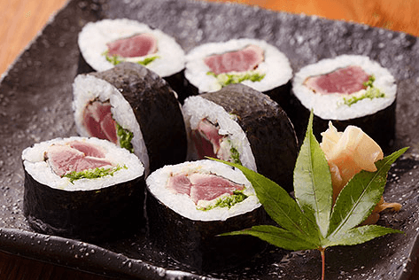土佐巻とは、鰹のたたきを小さく切り、にんにくやねぎなどの薬味とともに巻いた巻きずしです。