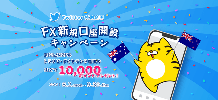 FXの新規口座開設時に当社公式Twitterアカウントで公開中のキーワードを入力いただき、口座開設後に100万円以上の入金&対象のトラリピ戦略をご注文いただくと、もれなく10,000マネースクエア ポイント※をプレゼントいたします。