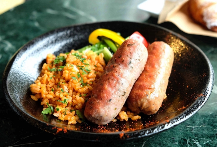 9月1日(水)から始まる第三弾は、「代官山ASO チェレステ 日本橋店」シェフの菊池恒毅が担当。ナポリの郷土料理をイメージして作られたメニューは、2種類の自家製「サルシッチャ(腸詰)」をメインにトマト、ベーコン、ガーリック、ブロード(イタリアの出汁)で炊いたピラフを添えて。数種類のハーブやスパイスを加えて丁寧に手作りしたサルシッチャは大ぶりで歯ごたえもあり、食べ応え十分です。