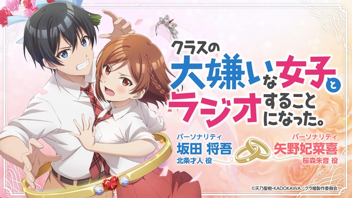 そして、TVアニメ「クラスの大嫌いな女子と結婚することになった。」公式ラジオ番組「クラスの大嫌いな女子とラジオすることになった。」の制作も決定いたしました!北条才人役の坂田将吾さん、桜森朱音役の矢野妃菜喜さんがメインパーソナリティーを務め、12月19日(木)より配信開始となります!是非アニメ放送と合わせてラジオ番組もお楽しみください。