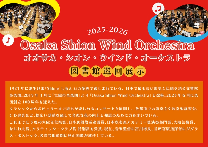 好評につき昨年に引き続き開催決定!「Osaka Shion Wind Orchestra 2025年度図書館巡回展示」、大阪市立鶴見図書館から展示スタート!