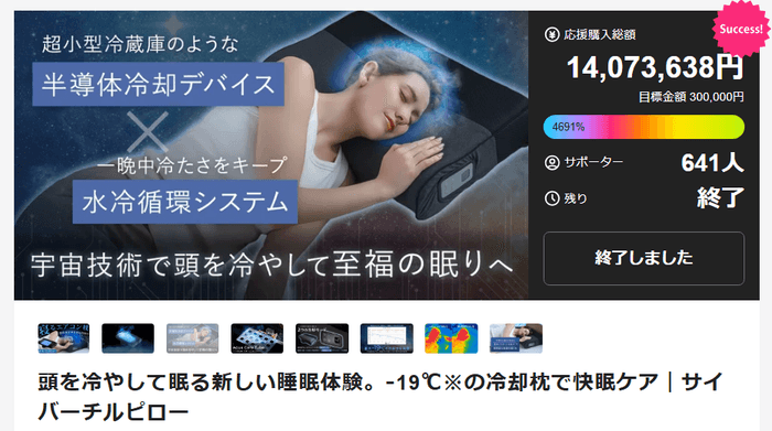 半導体技術による冷却加熱機能と、水循環システムを搭載した冷却枕、サイバーチルピローは2025年3月26日にMakuakeで先行販売を開始し、気温が高くなるにつれ多くの反響をいただくようになりました。その結果、目標金額の3000%を達成しプロジェクトは大成功を収めました。