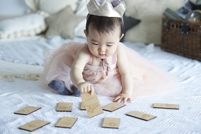 「選び取りカード」とは、1歳を迎えた子どもから少し離れたところに、ペンやボールなど象徴的なアイテムを並べて最初に何を手に取るかで将来を占う「選び取り」をアレンジしたカードです。例えば、キッチンアイテムが描かれたカードを選ぶと将来料理人になれるなど、子どもが自分の将来を占う遊びができます。子どもがどのカードを選ぶのかを家族で予想したり、子どもがカードめがけて向かう様子を応援したり、いろいろな楽しみ方があります。
