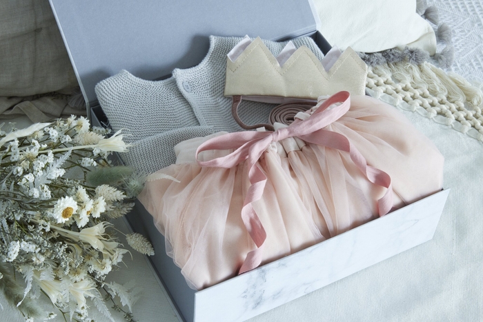 チェックイン後お部屋に入ると、MARLMARLが本プラン用にセレクトした洋服が「バースデーボックス」として、可愛らしくラッピングされています。内容は、チュールドレスやクラウンなど記念日のお祝いにぴったりな洋服のセットで、持ち帰りができます。長く着られる機能的なアイテムを選べば、来年の誕生日にも着ることが可能。また、「バースデーボックス」は全5種から好きなものを宿泊予約時に選べるので、どれが似合うだろうというワクワク感を出発前から楽しめます。洋服に