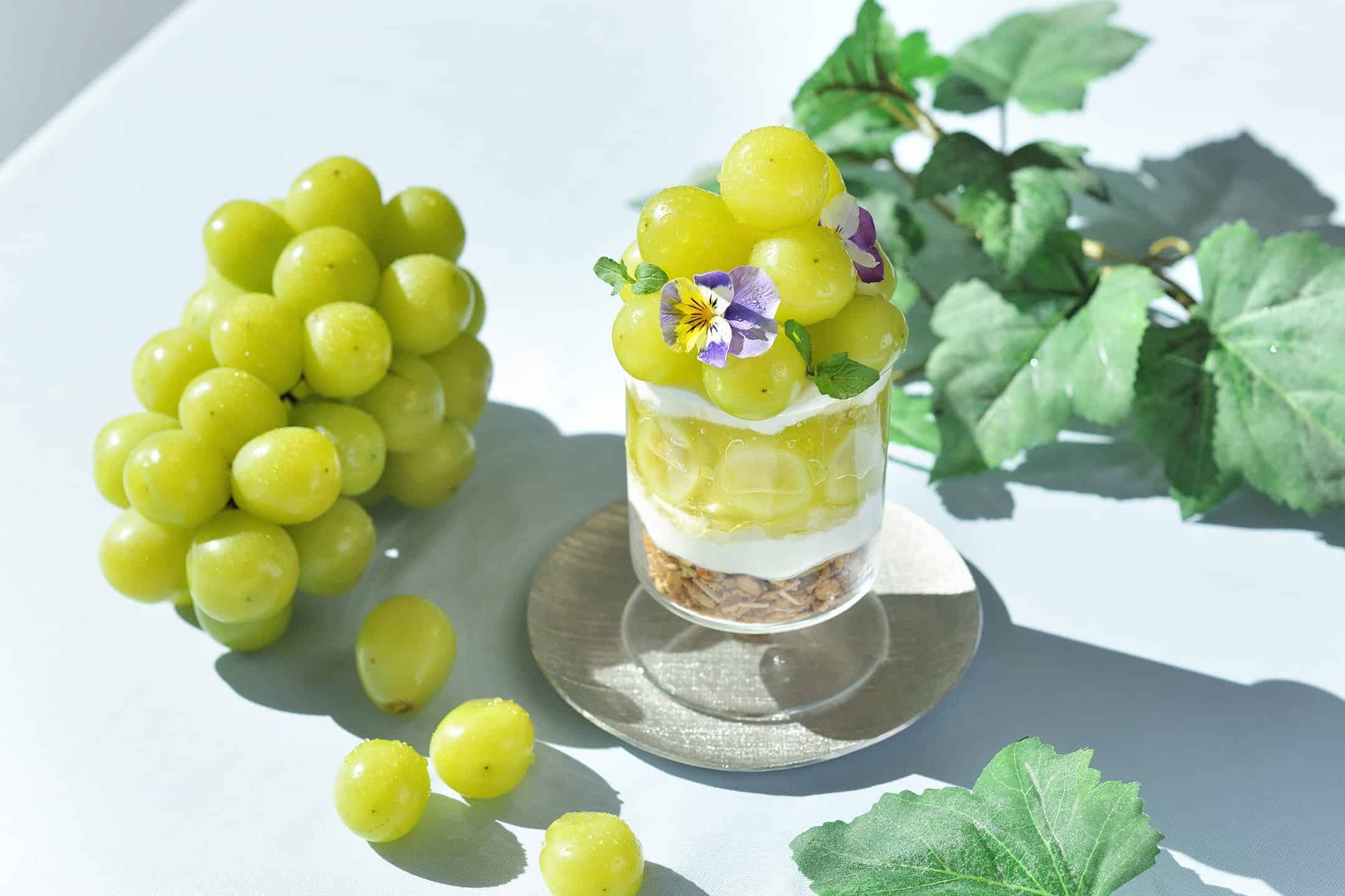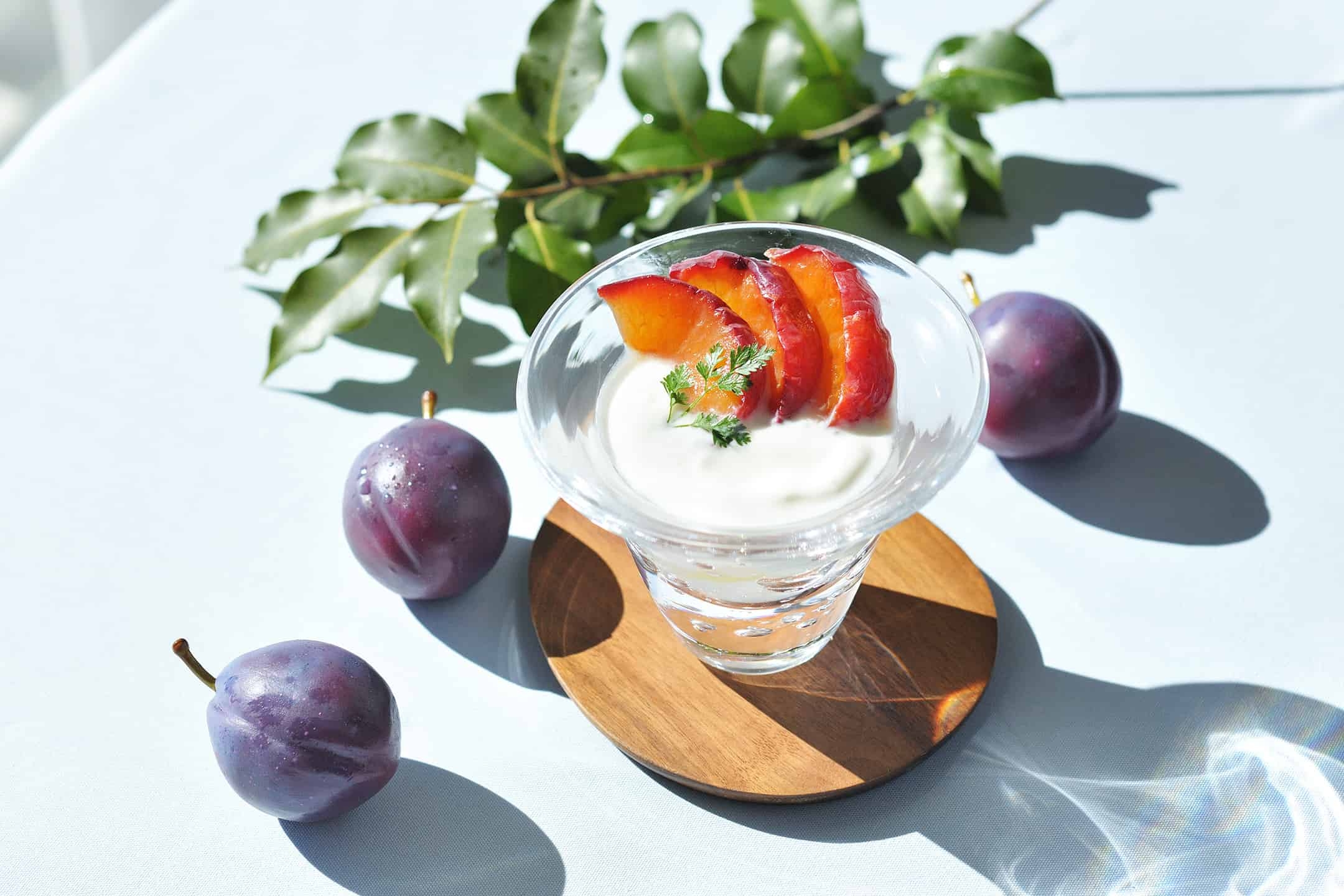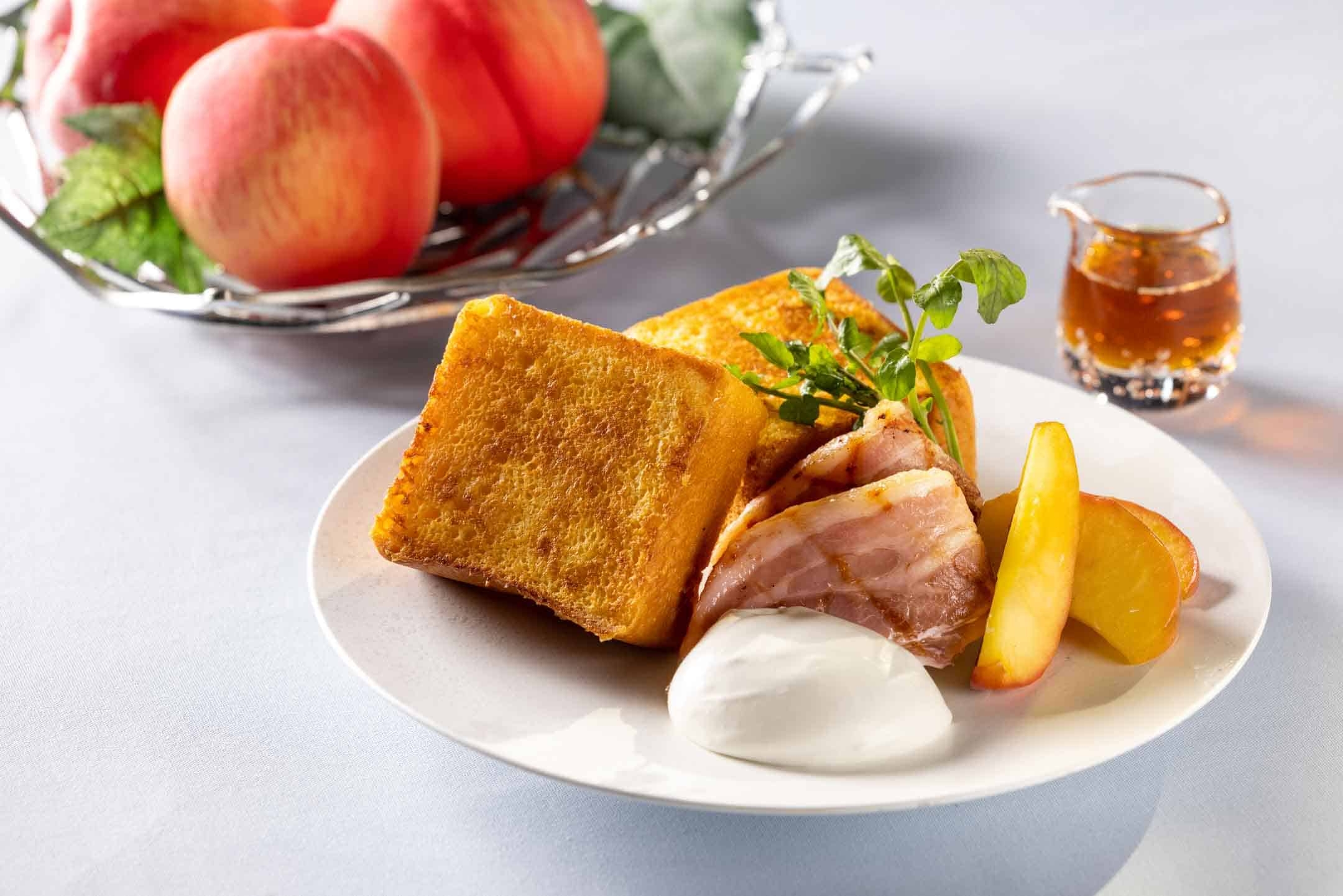 プラム、桃、葡萄の山梨三大フルーツを一度に楽しむことができます。ジュースやサラダでそれぞれのフルーツの持つ味わいを楽しんだ後は、3種のフルーツごとの魅力を最大限に引き出した朝食を提供します。プラムは甘味を活かしたコンポートにし、濃厚な味わいが特徴のヨーグルトと合わせます。桃はスキレットでジューシーに焼き上げ、甘味をさらに引き出し、フレンチトーストやベーコンと味わいます。葡萄に合わせるのは白ワインビネガーのジュレです。シャンティと共に甘味と酸味のバランスの良いパルフェに仕上げます。