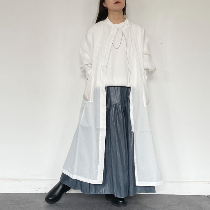 ブルゾンと同素材のコートは、長めの着丈でも透け感があるので軽やかな印象です。後ろのギャザーを絞るとメリハリがついてすっきりと着られます。