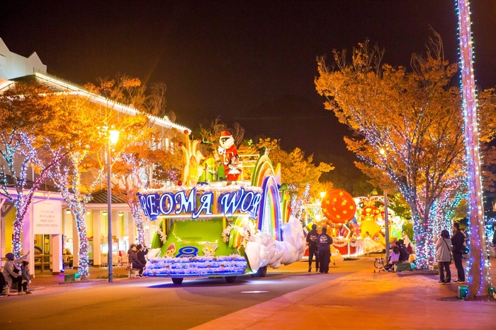 マツケンサンバの曲とともにゴールドツリーが点灯。パーク内のイルミネーションも輝きます。