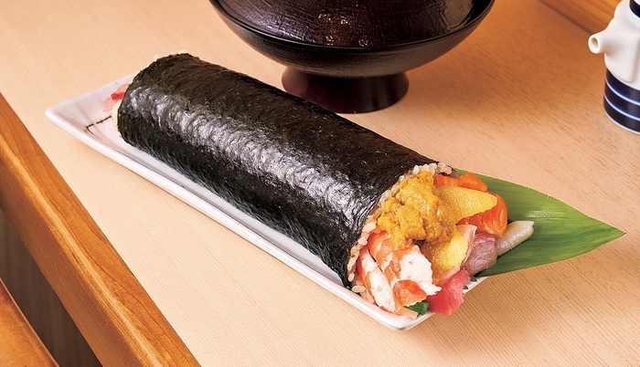 天然大間本まぐろ、真鯛、サーモンなど12種もの海鮮が巻かれた鮮魚専門店の豪華恵方巻。