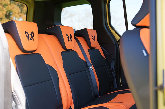 オレンジと黒のツートーンで、背もたれ部にはフレンチブルドッグロゴが刺繍されています。