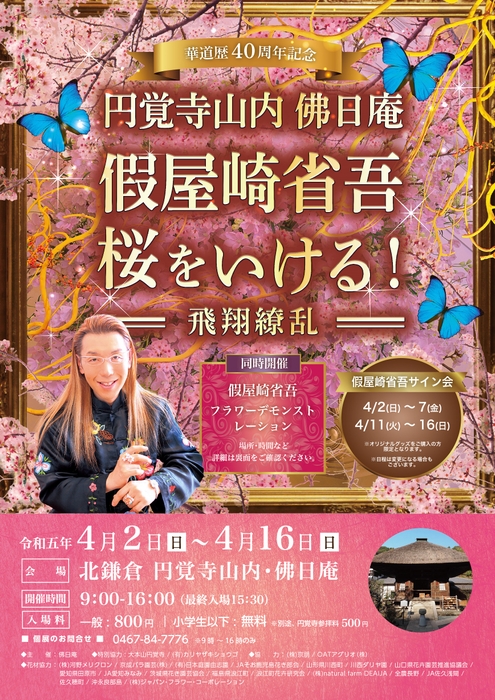 佛日庵主催、華道歴40周年記念 円覚寺山内佛日庵 『假屋崎省吾 桜をいける! ―飛翔繚乱―』が2023年4月2日 (日) ~2023年4月16日 (日)に円覚寺山内・佛日庵(神奈川県鎌倉市山ノ内409)にて開催されます。