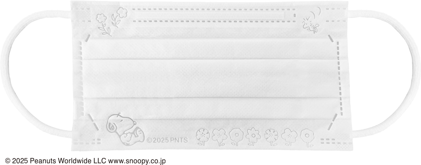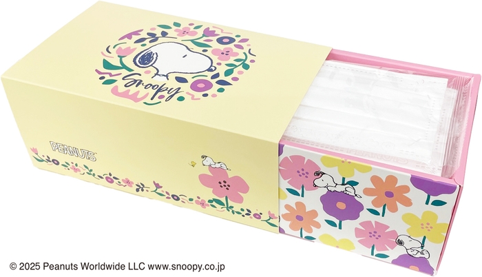 今作は自然をテーマにしたデザインとなっております。マスク本体にはお花畑の中でまどろむスヌーピーがエンボスデザインで施されており、穏やかな時間を演出しています。さりげない小さなお花とウッドストックもいます。スリーブボックスなので、普段使いと収納にも便利です。取り出す際にもかわいい要素が満載の箱のデザインも是非楽しんでください。