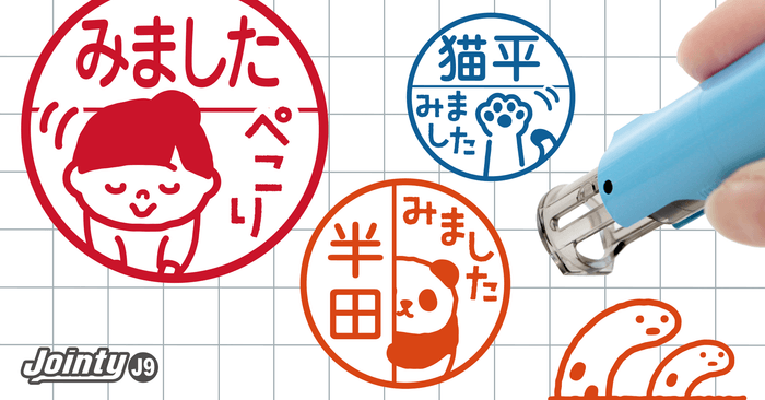 キャップレスで軽い押し心地の回転式ネーム印「Jointy J9」を採用。浸透印ではなくゴム印タイプのため、 イラストの細かい部分も鮮明に表現できます。持ち歩きしやすい工夫がされており、スタンプ台内蔵で連続押印してもかすれません。