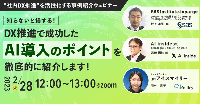 今回のウェビナーでは、DX推進に強いSAS Institute Japan社とAI inside社がDX推進で成功したAI導入のポイントを徹底的に紹介します!ぜひご参加ください。