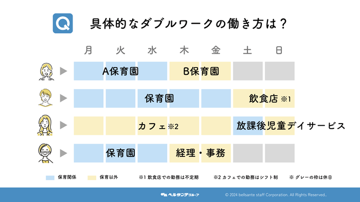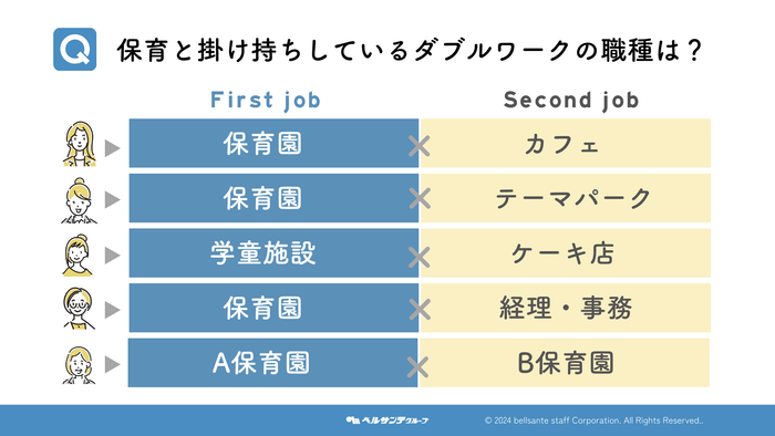 ・「平日週2日は保育園で1、2歳児のクラスで勤務し、土日を含む週3日はテーマパークでレジのお仕事をしています」