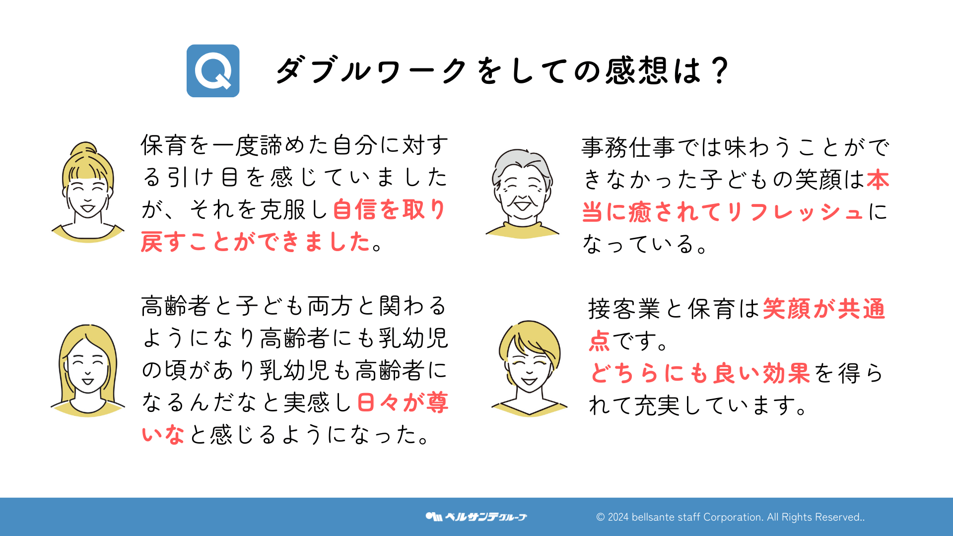 ・「家族の仕事を手伝うことになり退職を考えましたが、保育園から『短い時間でもいいので来てほしい』と言っていただいてダブルワークをすることになりました」