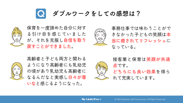 大阪市淀川区 - 保育に特化した人材サービスを提供するベルサンテスタッフ株式会社(本社:大阪市淀川区、代表取締役:中野 栄造)は、保育士不足が深刻化する中、新しい働き方として注目されている「ダブルワーク」についてデプスインタビューを実施しました。この調査結果を2024年12月26日に公開いたします。調査した結果、取材者の100%が今の働き方に満足しており、今後もこの働き方を続けたいという結果があきらかになりました。