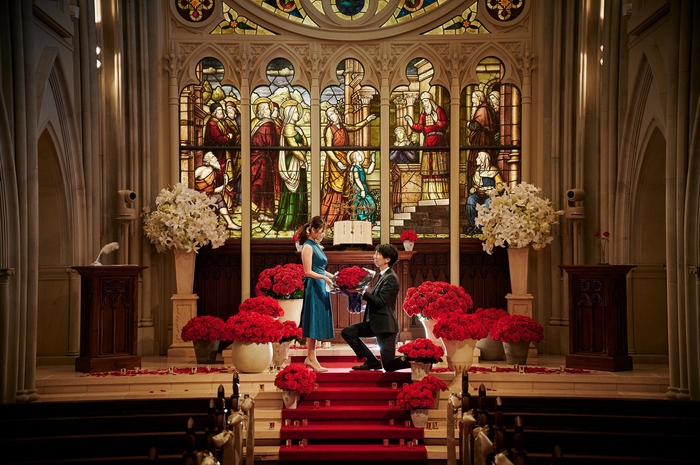 チャペルの祭壇を彩るのは、「1万年の愛を誓います」の意味を持つ1,000本の大輪の赤バラのアートフラワー(造花)。チャペルの扉を開けるとそこには映画のワンシーンのようなロマンティックな空間が広がります。普段は入ることのできない「チャペル」という神聖な空間を、まるでふたりを主役とした映画の舞台のようにドラマティックに彩ります。ステンドグラスが美しい重厚なチャペル、自然光が主役のお二人を優しく包み込む森に囲まれたチャペル、夜景がドラマティックに煌めく独立型のチャペルなどに加え、緑あふれるガーデンや、水辺のテラスなどにも設置可能なので、趣の異なる様々なプロポーズのための特別な空間をお選びいただけます。
