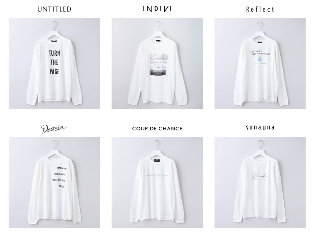 「アンタイトル」「インディヴィ」「リフレクト」「デッサン」「クード シャンス」「スーナウーナ」の6ブランドを横断させるこの企画は、フィールズインターナショナルが提案する商品を社会貢献に繋げたいという思いで、今年7月にスタートしました。第一弾の半袖Tシャツはワールド オンラインストアと各ブランドの店頭で発売し好評を得ており、今後もおよそ2ヵ月単位で対象アイテムを変えて展開します。