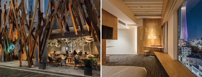 芸術家のアトリエをイメージしたスイートや、コンテンポラリーで機能性を追求した142室の客室には、客室タブレットを全室に導入。客室天井高は2.45m以上とリゾートホテルにいるような開放感を演出しています。東京観光の代表的スポット、東京スカイツリー®︎で有名な押上駅より徒歩3分で、ビジネスでもレジャーでも理想的なロケーションにあります。4路線の駅が集積し、羽田・成田の両国際空港へのアクセスはもちろん、観光客から地元の方まで利便性の高いホテルです。外観やインテリアのデザイン監修は、世界的に著名な建築家・隈研吾氏によるもので、伝統的な木組みと工業的なイメージを融合させ、このエリアにふさわしいコントラストを表現しています。