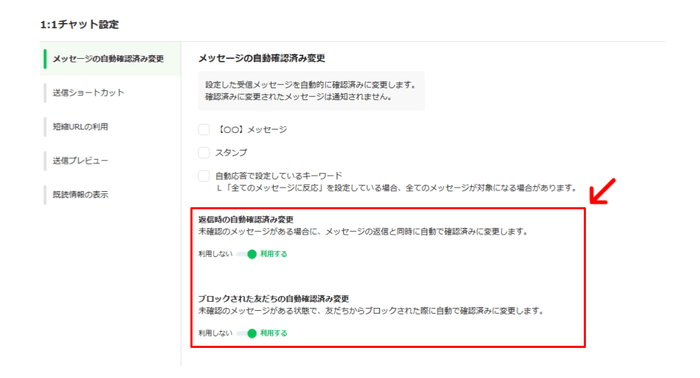これらの設定をオンにすると、チャット返信時や友だちにブロックされた際に自動でメッセージを確認済みにできるため、メッセージ管理の手間を大幅に削減できます。