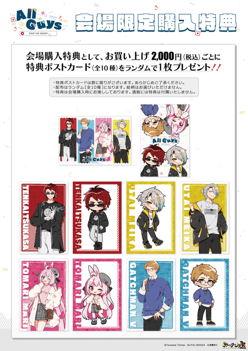 大日本印刷株式会社(DNP)が、一般社団法人日本動画協会(AJA)と共同で運営する「東京アニメセンター in DNP PLAZA SHIBUYA」では、『AllGuys』のPOP UP SHOPを開催いたします。描きおこしイラストの新発売アイテムなどを取りそろえるほか、キャラクターパネルの展示も行います。