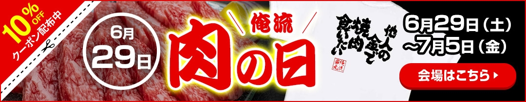 6月29日は、俺流肉の日。6月29日から先着100注文に、肉Tシャツを通常価格より10%オフになるクーポンを配布いたします。この機会に、ご自宅用はもちろん、ギフト用としてもぴったりなTシャツをお求めください。